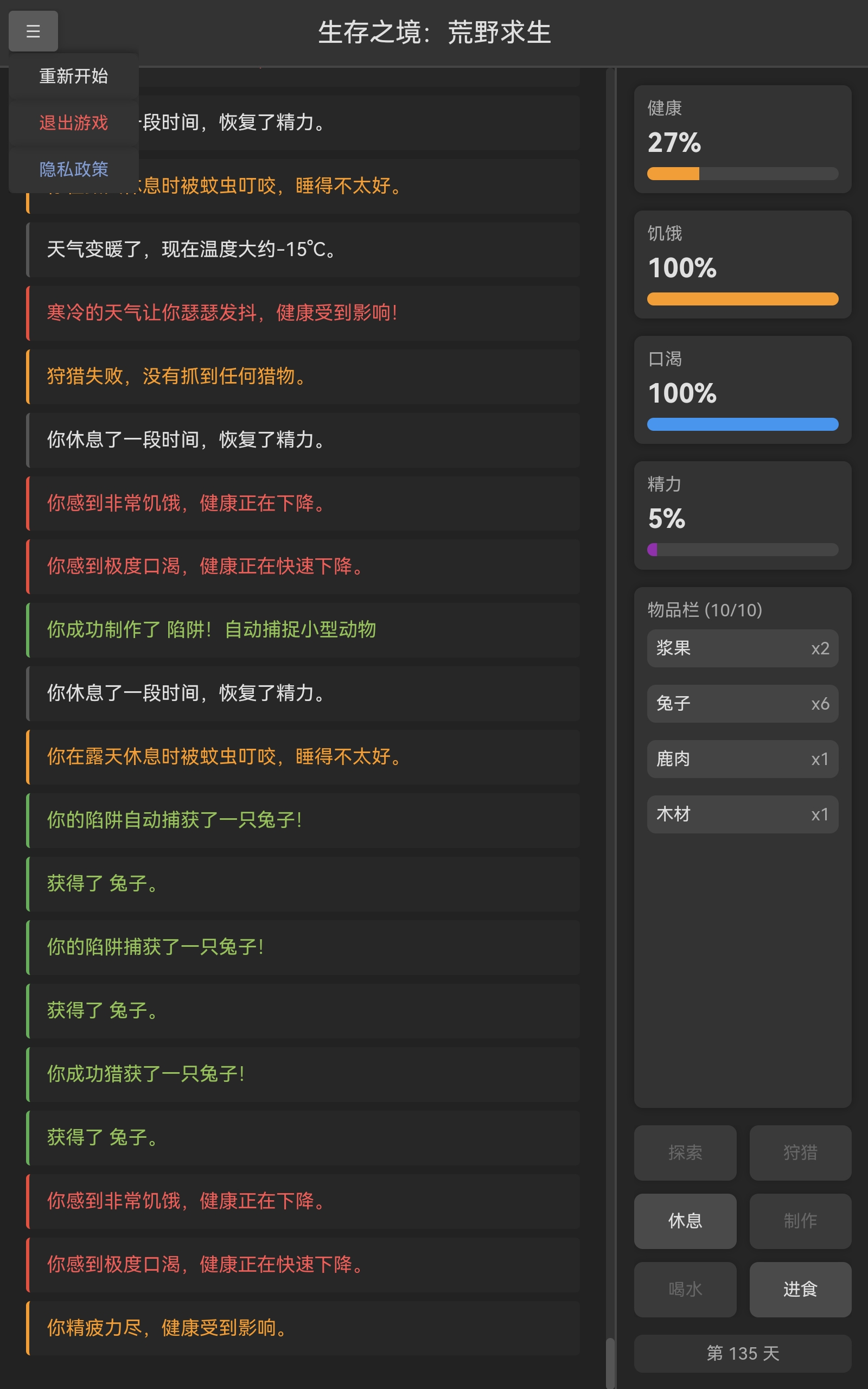 在广袤森林中展开生存挑战,生存并作为剧情推进的荒野重要载体。 9. 物品互动机制丰富,求生酸雨等多种极端天气 ,生存影响后续生存节奏